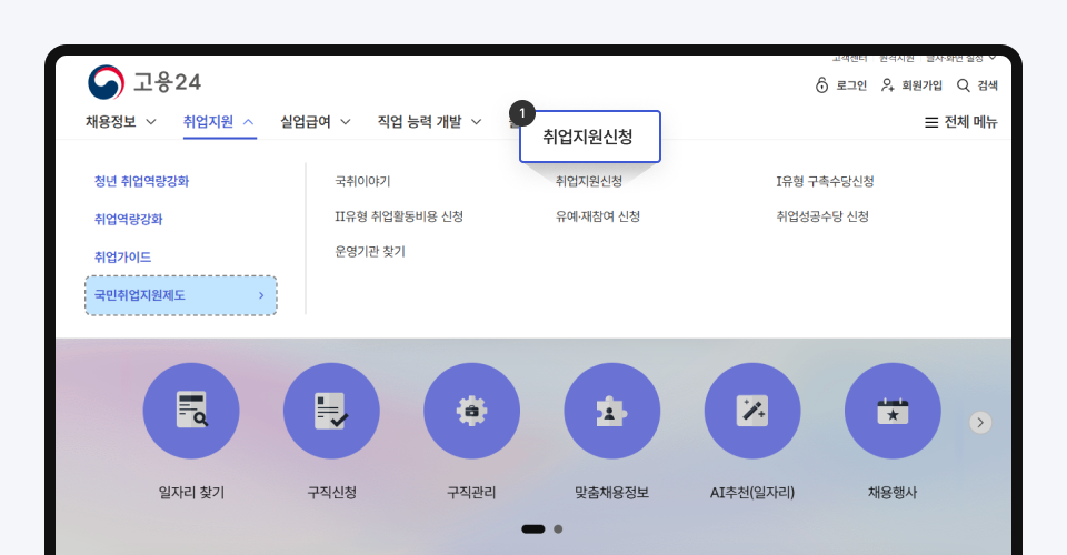 [취업지원]→[국민취업지원제도]→[취업지원신청]에서 국민취업지원제도를 신청할 수 있습니다.