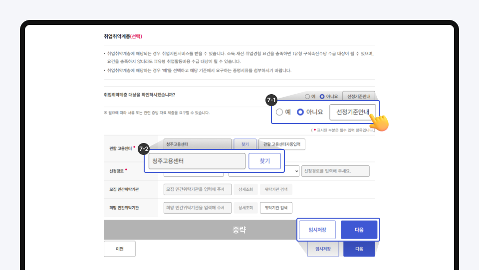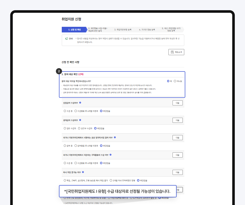[선정기준안내]를 클릭하여 대상이 되는 경우 '예'로 선택하여 진행하십시오.