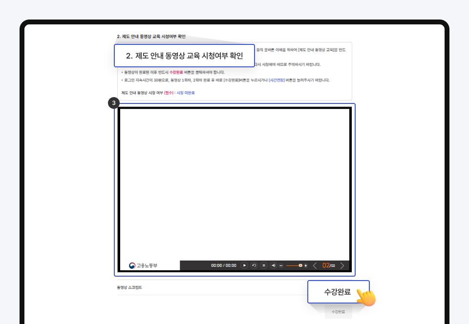 제도 안내 동영상은 반드시 시청해야하며, 1회차, 2회차 모두 수강완료 되어야 다음 단계로 진행이 가능합니다.※ 1회차 완료되면 2회차를 시청 후 반드시[수강완료]버튼을 클릭하시기 바랍니다.
