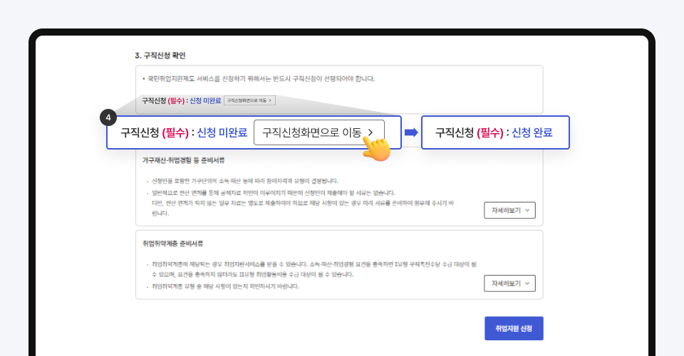 구직신청은 사전에 필수로 신청해야하는 사항이며, '신청완료'로 표시되어야 다음단계로 진행이 가능합니다.'신청 미완료'로 표시되는 경우 반드시 [구직신청화면으로 이동] 버튼을 클릭하여 구직신청서를 제출 후, 다시 취업지원신청을 진행해주시기 바랍니다.