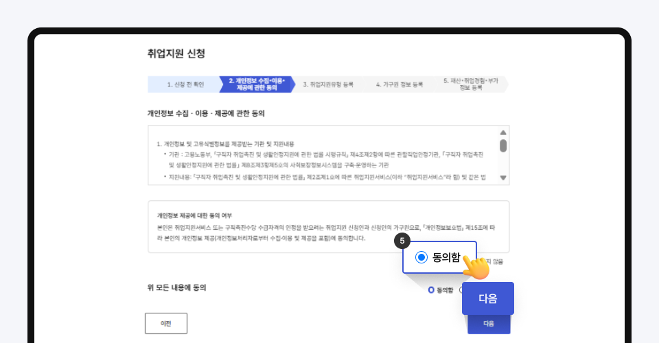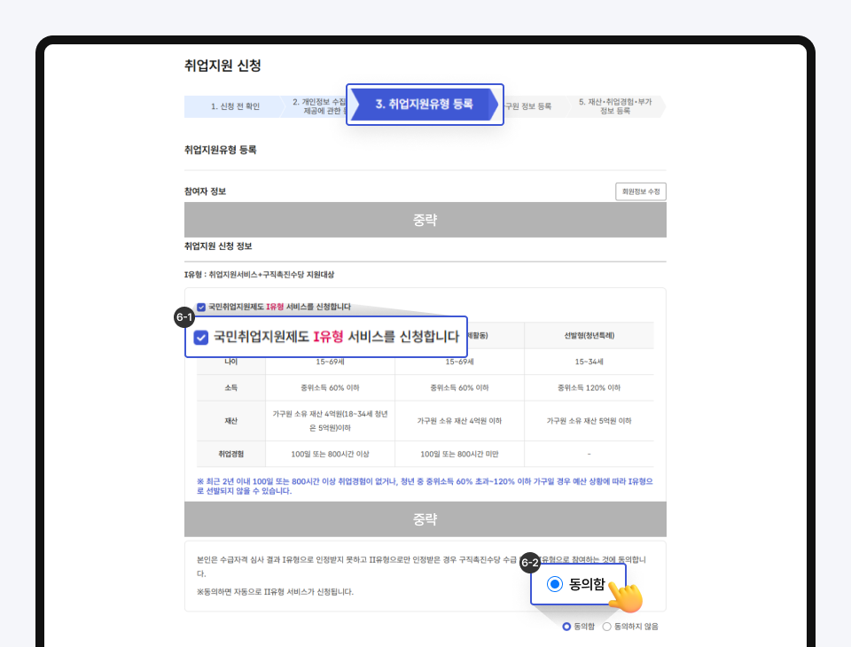 Ⅰ유형 심사 시 수급자격 조건이 충족 못하는 경우 Ⅱ유형으로 바로 심사될 수 있도록 '동의함'을 선택 하실 수 있습니다.※ '동의하지 않음' 선택 시, Ⅰ유형 신청이 불인정되어 Ⅱ유형으로 재신청을 원하실 경우에는 취업지원 신청서를 다시 작성하여 제출해 주시기 바랍니다.