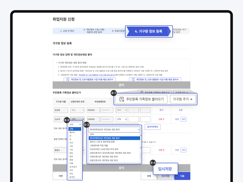 [임시저장]클릭 후 각 동의방법에 대해서 가구원별로 정보제공 동의를 받으시기 바랍니다.
