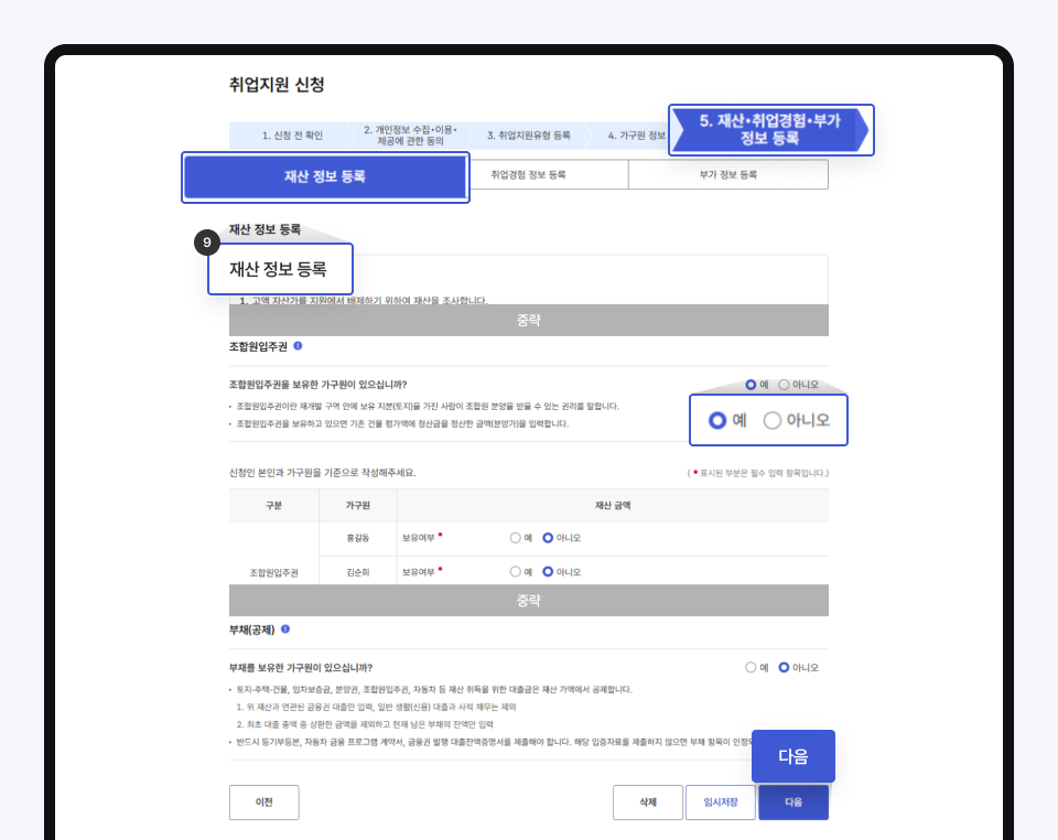 공적정보로 소득/재산 정보에 대해서 심사에 활용하나 조합원입주권. 분양권, 부채 정보가 있는 경우 '예'를 선택하여 가구원 별 입력하시기 바랍니다.※ 취업지원유형 등록 시 Ⅰ유형으로 선택한 신청인만 재산정보를 등록 할 수 있습니다.