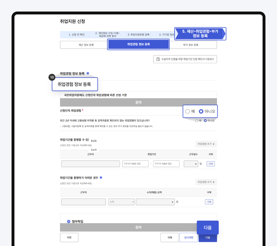 신청일 기준 이전 최근 2년간의 취업경험이 있으신 경우, '예'를 선택하여 정보를 등록 하시기 바랍니다.(단, 고용보험 및 사업자등록 이력은 자동 확인됩니다.)※ 취업지원유형 등록 시 Ⅰ유형으로 선택한 신청인만 취업경험정보를 등록 할 수 있습니다.