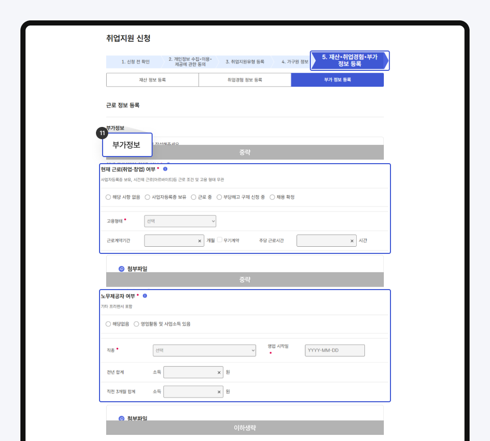 취업지원신청이란 국민취업지원제도를 신청하기 위한 신청서 입니다. *취업지원신청 단계 [1.신청 전 확인]→[2.개인정보 수집·제공에 관한 동의]→[3.취업지원유형 등록]→[4.가구원 정보 등록]→[5.재산취업경험부가정보등록]→[6.제출] (마지막 [취업지원 신청인에 대한 안내사항]화면에서 "제출"버튼을 클릭해야 취업지원신청이 제출이 완료됩니다.)
