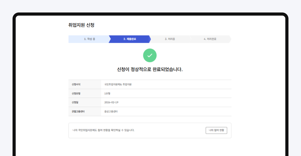 [제출]버튼 클릭시 취업지원신청 민원 접수가 완료되어 수급자격 심사 단계로 진행됩니다.